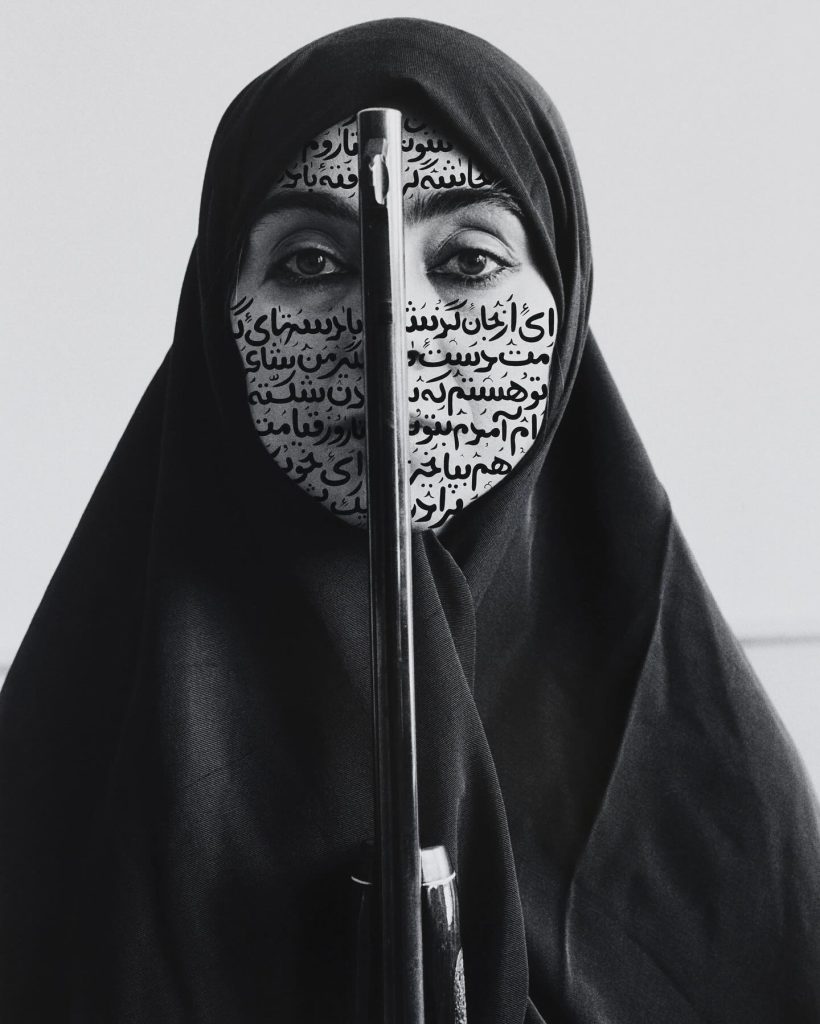 Her groundbreaking photographic series, “Women of Allah,” combines portraits of veiled Iranian women with intricate Persian calligraphy, addressing the intersections of femininity, religion, and political identity. This series thoughtfully critiques and explores Western perceptions of Islamic culture, inviting viewers to engage deeply with personal and collective narratives of resilience, oppression, and strength.